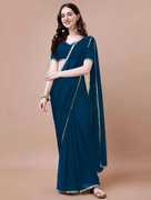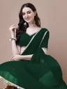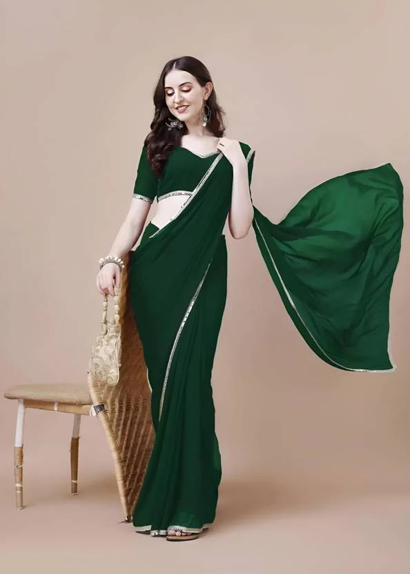 This is a beautiful dark green saree with a simple yet elegant design. The saree features a delicate silver border that adds a touch of sophistication. The fabric appears to be lightweight and flowy, making it perfect for festive occasions or evening wear. The model is wearing a matching dark green blouse with silver detailing on the sleeves, complementing the saree beautifully. She accessorizes with statement earrings, bangles, and a beige embroidered handbag, adding to the ethnic charm. The saree is draped gracefully, with the pallu flowing in the air, creating a stylish and graceful look. This saree is ideal for celebrations, weddings, or cultural events, offering a perfect blend of traditional and modern aesthetics. Would you like recommendations on how to style it further?