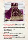 * Lehenga Fabric: Shimmer Silk, Work: Heavy Embroidery Work & Stone Work * Measurements: Lehenga Flair : 2.70m, Waist-42", Height-45"; Blouse(Unstitched) : 2.10 m ; Dupatta Length: 2.50 m * Lehenga: Semi-Stitched and Blouse: Unstitched * Package Contains: 1 Lehenga, 1 Dupatta, 1 Blouse, 18 Inner