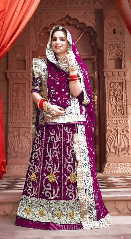 * Lehenga: Semi-Stitched and Blouse: Unstitched * Package Contains: 1 Lehenga, 1 Dupatta, 1 Blouse, 18 Inner * Rajputi Poshak is a very famous type of clothing in India. It is known for its beautiful designs and colors. this Rajputi Poshak is made of fabrics shimmer silk , and it is embroidered with gold and silver thread. Rajputi Poshak is usually only worn by wealthy women, but it is becoming more popular among all women in India. * Rajputi Poshak is not only a beautiful piece of clothing, but it also has a rich history and cultural significance. It is traditionally worn by Rajput women on special occasions, such as weddings and festivals. * The Poshak consists of a long skirt, known as the lehenga, and a blouse called the choli. The Dupatta, a long scarf, is also worn with the Poshak. Rajputi Poshaks are usually quite elaborate, and the women who wear them are often seen as symbols of Rajasthan’s rich culture and heritage. * In recent years, the Rajputi Poshak has become quite popular outside of Rajasthan as well. Many women from other parts of India and even the world have started to wear this beautiful dress on special occasions.