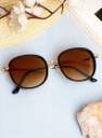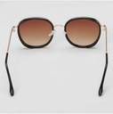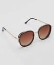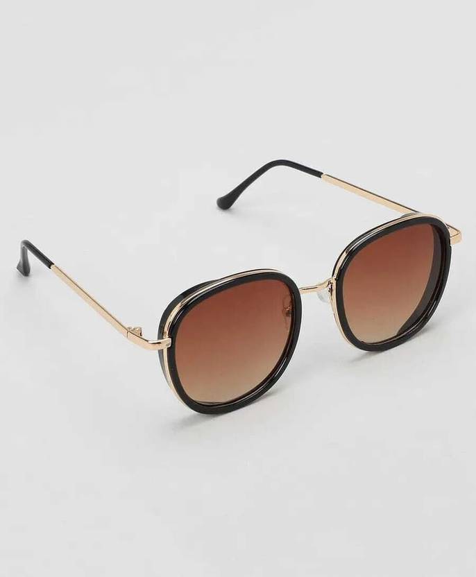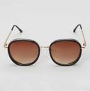 The Sunglass Are Off-white with round frame and black lenses. They feature a thin gold-tone metal frame around the lenses. The image shows round sunglasses with a white frame and brown lenses. The frame is thick and round, with gold accents at the hinges and temples. The lenses are a gradient brown color, fading from dark at the top to lighter at the bottom.