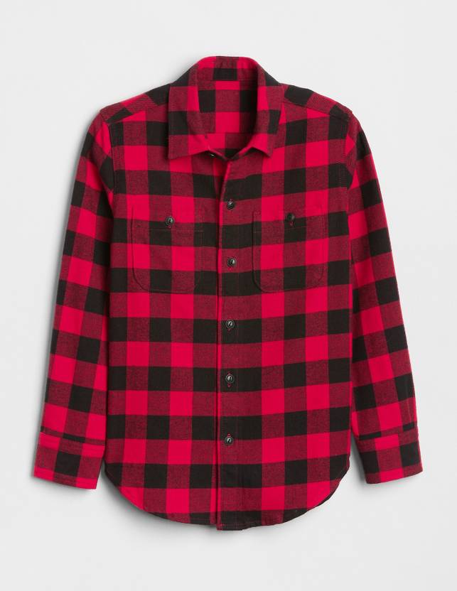Smooth flannel weave.Long sleeves with button cuffs.Spread collar, button front.Button-patch pockets at chest.Curved shirttail.Allover buffalo plaid.