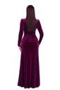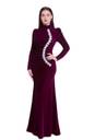 Make a stunning entrance in this luxurious burgundy velvet evening gown. The floor-length dress features an elegant high neckline and long sleeves, creating a sophisticated silhouette perfect for formal occasions. The rich velvet fabric drapes beautifully, while the diagonal line of intricate silver floral embellishments adds a touch of glamour and draws the eye. The fitted bodice and flowing skirt create a flattering form, with subtle gathering that enhances the natural movement of the fabric. The deep burgundy colour provides a regal touch, making it an excellent choice for evening parties, formal events, or special celebrations. The gown's design combines classic elegance with modern details, featuring carefully tailored seams and a graceful sweep. The back of the dress maintains the sleek profile, complementing the overall refined aesthetic. This evening gown is a perfect choice for those seeking to make a memorable impression at their next formal gathering. NOTE dress sizes shown in images.
