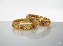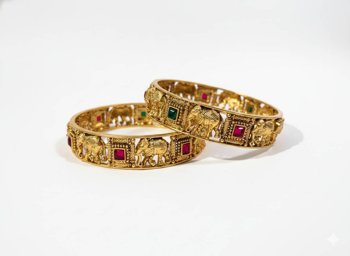 The bangles are beautifully detailed with elephant motif metal embellishment and red & green stone studded accents, making them perfect for weddings and festive occasions.