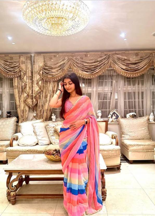 throughout the day. The saree features a vibrant striped design, which infuses a modern twist into the classic saree style. The alternating stripes in rich, bold colors add a dynamic, eye-catching element, while maintaining the refined sophistication of traditional Indian attire. Whether you're attending a wedding, festive celebration, or