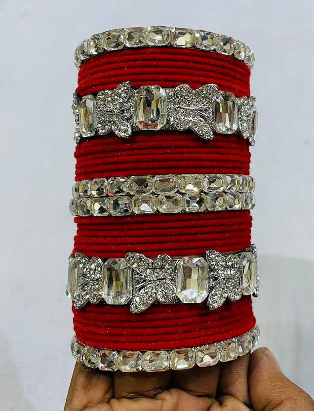 Add a royal touch to your traditional look with this Metal Velvet Bangle Set, beautifully crafted with premium velvet wrapping and sparkling stone studded kadas. The vibrant red color paired with golden crystal embellishments gives a luxurious bridal feel, perfect for wedding ceremonies, haldi–mehndi events, festivals, and special occasions. Designed with durable metal base and soft velvet texture, these bangles offer comfort, shine, and long-lasting beauty. This complete set enhances both ethnic and Indo-western outfits effortlessly.