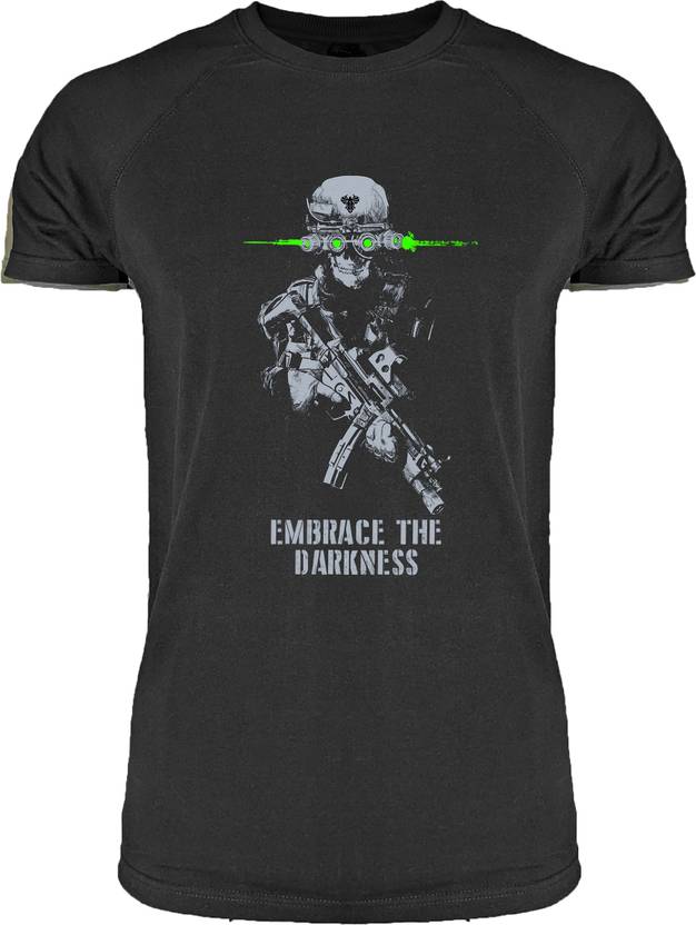 The Rookie Embrace the Darkness Graphic T-Shirt from Gearsmith is made from a premium cotton-spandex blend for comfort and flexibility. Featuring a special forces operator equipped with night vision goggles, this design captures the intensity of nighttime operations. The glow-in-the-dark print brings the graphic to life, making it a standout piece for those who thrive in the shadows and embrace the unknown.