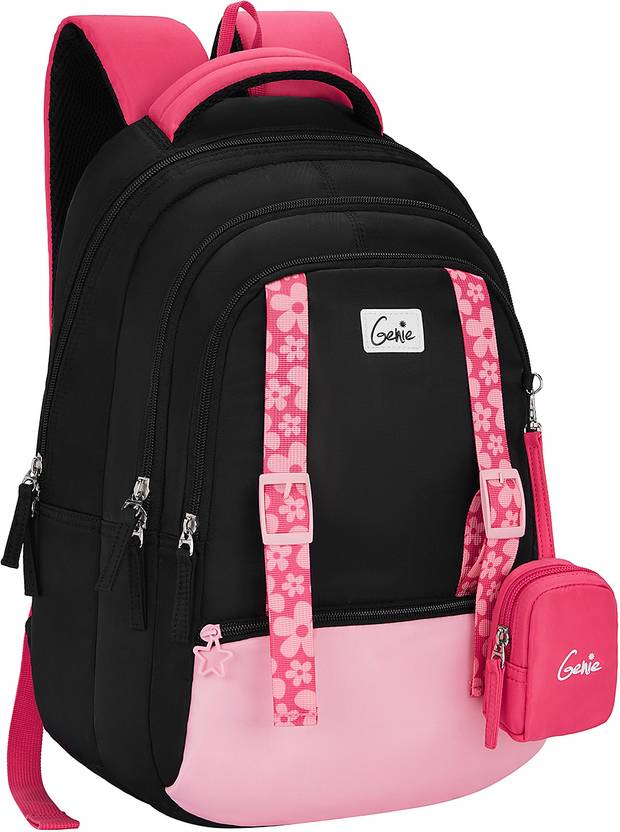 Stay chic and organized with the Genie Gemini Backpack in Black featuring classic floral prints. Ideal for girls aged 7-10, this 17-inch backpack combines style and practicality with a 27-liter capacity, three compartments, a file holder, and a front organizer for neat storage. The timeless floral design and included Happy Pouch add a delightful touch to your child’s school essentials.