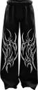 This image features a pair of black unisex baggy pants, showcasing a distinctive gothic or tribal-inspired aesthetic. The pants are presented from both front and back views, highlighting the prominent white graphic designs on the lower part of each leg.