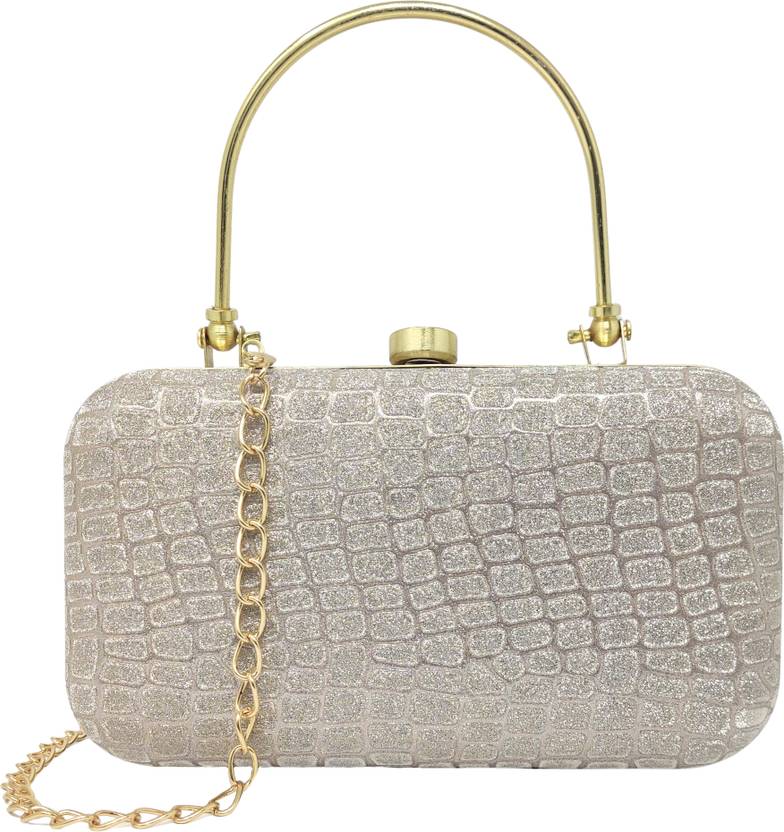 Make a stunning statement with this sophisticated evening clutch purse, perfect for special occasions and formal events. The exquisite crocodile pattern texture sparkles with a glamorous glitter finish in an elegant champagne gold hue. The luxurious design features a sturdy gold-tone metal handle and a convenient detachable chain strap, offering versatile carrying options. The structured box silhouette maintains its shape beautifully while safely storing your essentials. A secure clasp closure keeps your belongings protected in style. The compact yet practical size makes it an ideal accessory for weddings, parties, or any evening soirée. The textured pattern adds a touch of luxury while cleverly resisting visible fingerprints and scratches. This clutch seamlessly combines functionality with haute fashion, complementing traditional and contemporary outfits with its timeless appeal.