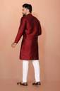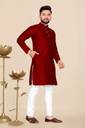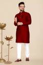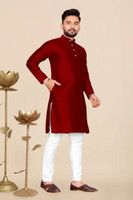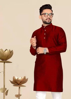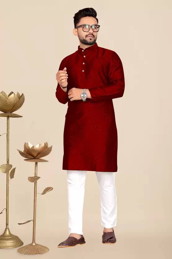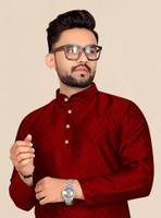 Offering a solid pattern with a subtle textured finish on the kurta, this men’s ethnic set presents a refined and composed look. The gentle texture adds visual depth, helping the kurta appear structured without heavy detailing. Furthermore, solid pattern pyjama pants keep this overall outfit balanced and understated. Together, the coordinated design supports traditional dressing with a clean and modern touch.