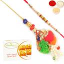 A beautiful set of bhaiya bhabhi rakhis traditionally designed with pearls, stones and american diamonds to make it unique in its own way..This comes with Besan Barfi sweets which have been packed using Italian Technology for an Extended Shelf Life (30 days).Roli, Chawal and chandan pouches go along with this product.