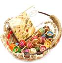 A beautiful Jute Cane reusable Basket containing a box of Soan Papdi (200 gms), a traditional Toran and a Pack of 6 Diyas. Net Weight: 200 gms. This mithai has been specially packed using Italian technology for an extended shelflife.