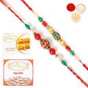 Set of 2 beautiful traditionally designed with pearls, stones and american diamonds to make it unique in its own way..This comes with Kaju katli or Besan Barfi sweets which have been packed using Italian Technology for an Extended Shelf Life (30 days).Free Roli, Chawal and chandan pouches go along with this product.