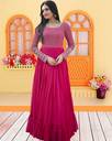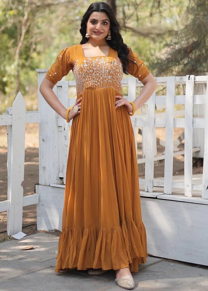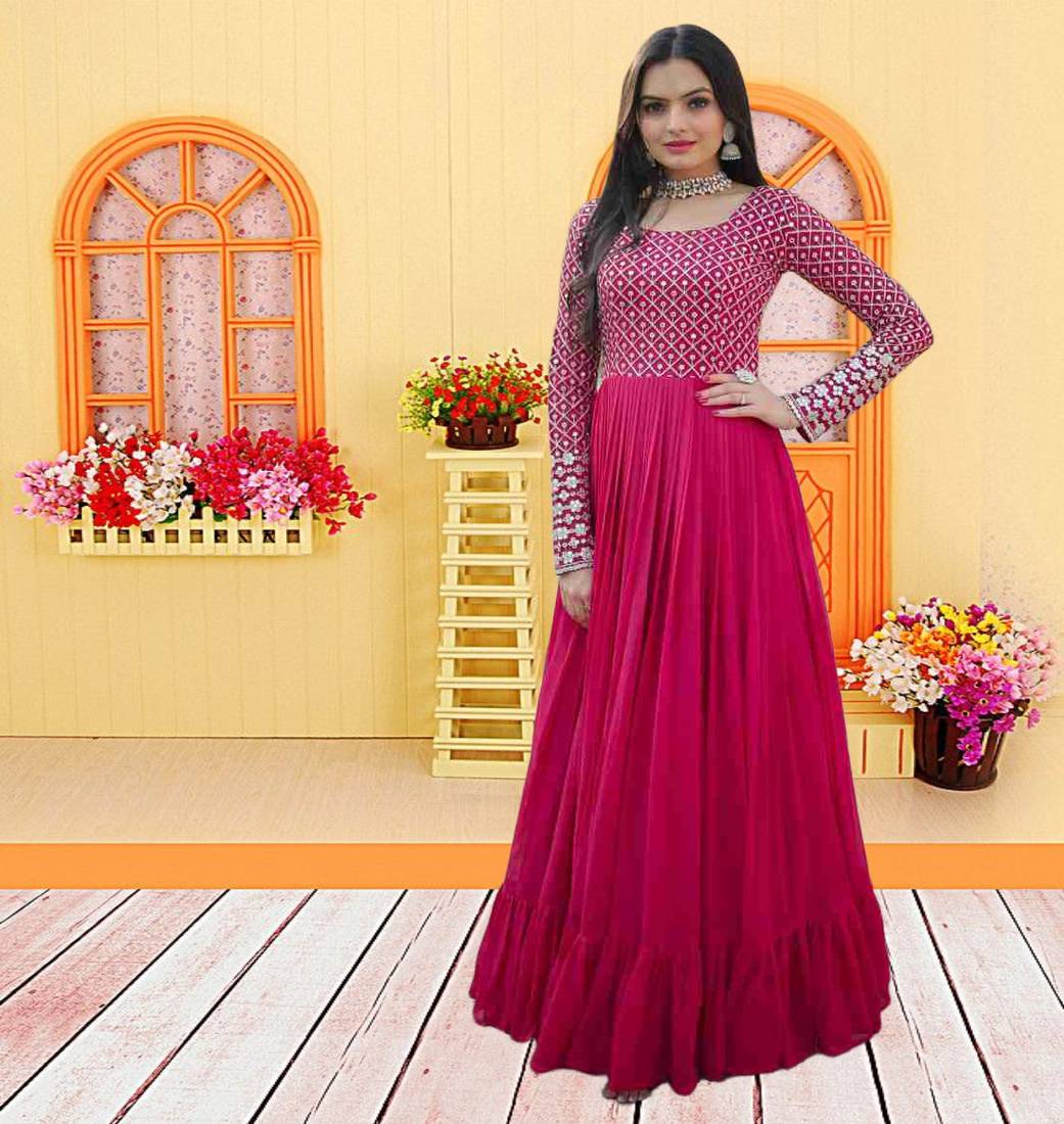 Drape yourself in timeless elegance with this exquisite black Anarkali gown, a perfect fusion of traditional charm and contemporary sophistication. Crafted from flowy georgette fabric, the gown features a floor-length silhouette with a beautifully pleated skirt. The standout feature is the intricately embroidered bodice and sleeves, designed with delicate white thread work in floral and geometric motifs. The round neckline and full sleeves elevate its regal appeal, making it ideal for festive occasions, wedding functions, or evening parties.