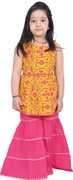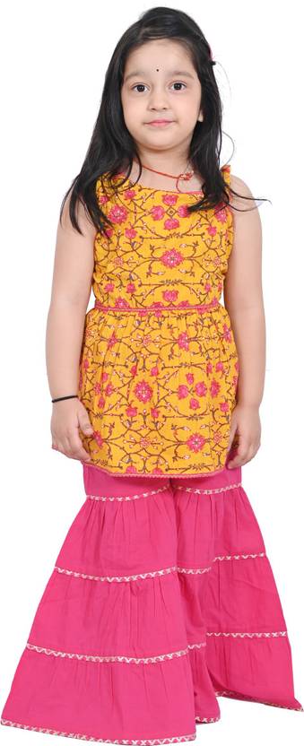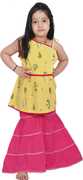 Your little one will be delighted all-seasons with this clothing set from Gianna . The two can be mixed and matched with other items in your baby's wardrobe for extra versatility. Bring out the fashionista in your little princess girl with this yellow sharara set. Created with soft and fine quality cotton fabric, this set comprises of a printed style kurta and sharara. It feature one shoulder, sleeveless with drawstring pattern, comes with side zip, foil print work at yoke and hem, and decorated gota patti lace. She will surely make an impact at parties with this gorgeous set paired up with a pretty bracelet and embellished juttis to finish the look.