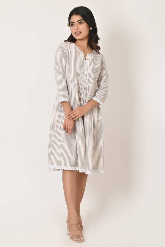 The dress is designed to fit snugly at the top and flare out slightly towards the bottom, creating a graceful and feminine silhouette. The knee-length design is perfect for formal occasions or dressy events, making it a versatile addition to any wardrobe.