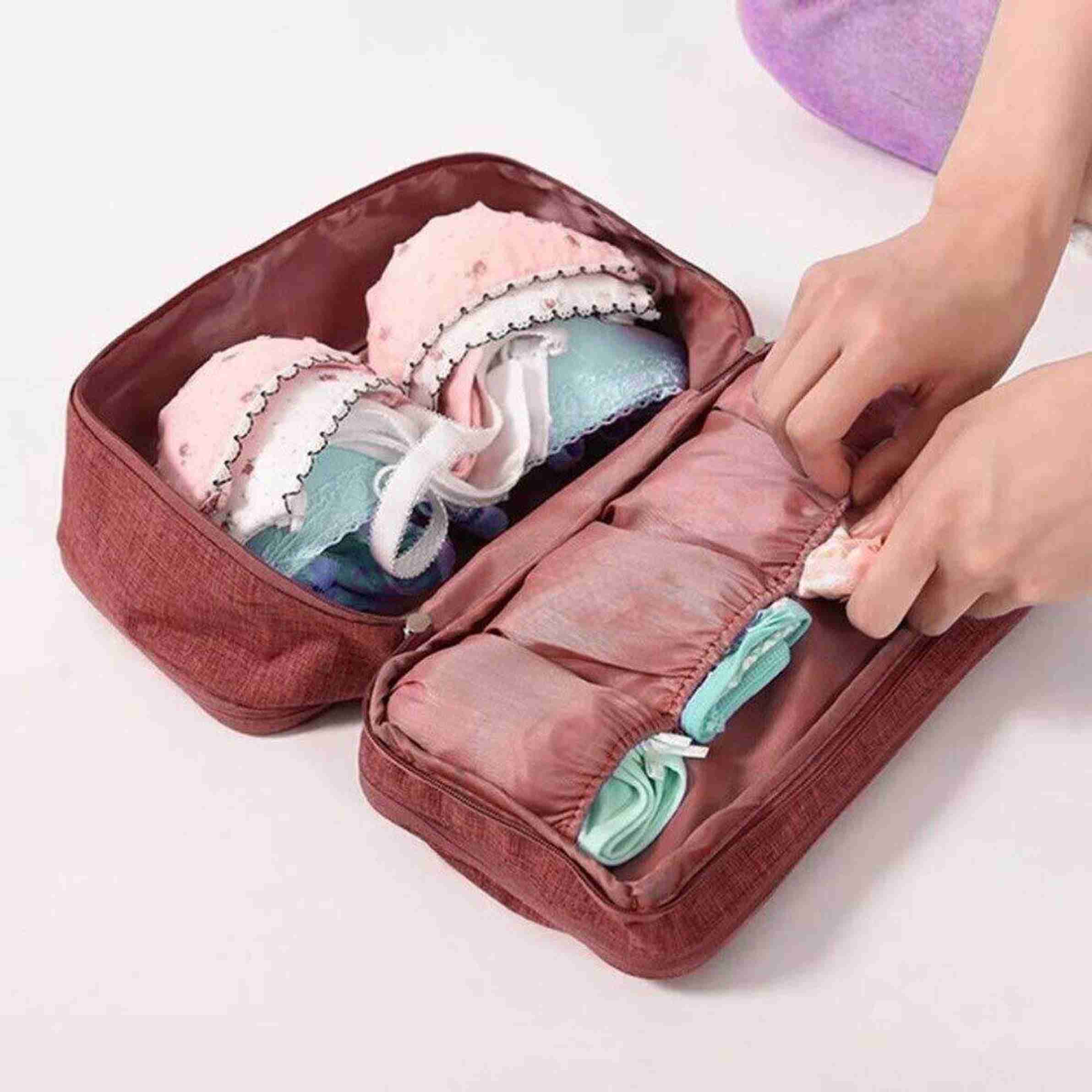 This underwear storage bag has 3 zippered compartments. In the main big compartment, you can store your bras or other bulky items., Made of high quality waterproof polyester, durable and breathable, protect your items from getting wet and dust all the time!, Perfectly fit all of your underwear, panties, bras, cosmetics, socks, accessories, toiletries on the go!, Fashion appearance, bright colors. Exquisite craftsmanship and tidy sewing thread. ,Multi-pocket design: Neatly classify underwear, socks, neck ties, bra etc