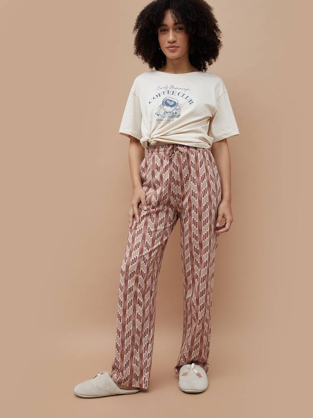 Adorned with bold prints, this pair of pyjamas is complemented with an elastic waistline, insert pockets and drawstring detail. An ideal pick for a leisure wardrobe, this one ensures durable comfort.