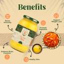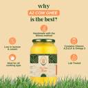 | Other Features | - 𝟏. 𝐁𝐈𝐋𝐎𝐍𝐀-𝐂𝐇𝐔𝐑𝐍𝐄𝐃 𝐀𝟐 𝐃𝐄𝐒𝐈 𝐆𝐈𝐑 𝐂𝐎𝐖 𝐆𝐇𝐄𝐄: Crafted from the A2 milk of grass-fed Gir cows in Gujarat, our ghee is made in small batches using the traditional Bilona method. Each jar reflects purity, care, and the highest standards of quality. We never use hormones or forceful methods to increase milk production., 𝟐. 𝐓𝐑𝐀𝐃𝐈𝐓𝐈𝐎𝐍𝐀𝐋𝐋𝐘 𝐌𝐀𝐃𝐄 𝐅𝐑𝐎𝐌 𝐂𝐔𝐑𝐃: Our ghee is made from curd, not cream—just as it should be. Fresh A2 milk is boiled, naturally set into curd, and hand-churned in both directions using a wooden bilona. The butter obtained is then slowly simmered to perfection. This artisanal process gives our ghee its rich aroma, grainy texture, and wholesome flavor., 𝟑. 𝐍𝐔𝐓𝐑𝐈𝐓𝐈𝐎𝐍-𝐑𝐈𝐂𝐇 𝐆𝐎𝐎𝐃𝐍𝐄𝐒𝐒: Packed with Omega-3 and Omega-6 fatty acids, our ghee is also rich in vitamins A, E, K, and conjugated linoleic acid. High in butyric acid and antioxidants, it supports digestion, boosts immunity, and helps detox the body naturally.