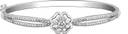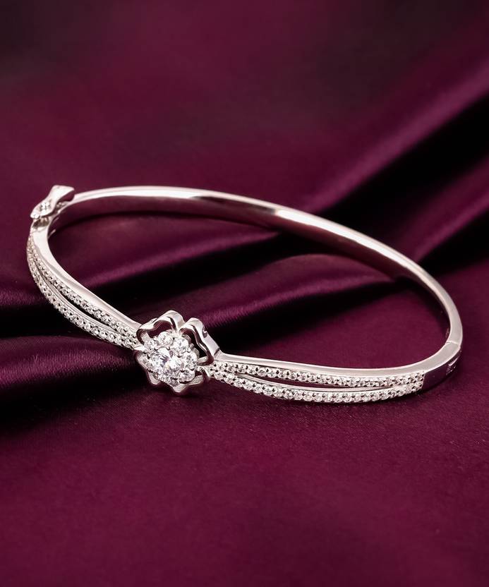 The silver bangle bracelet has a gorgeous centrepiece with a flower design studded with zircons.