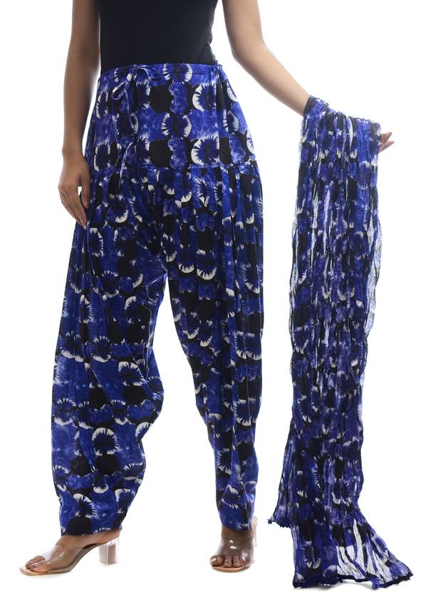 This is multicolor cotton all over printed patiala salwar with dupatta. Salwar length is 40-41 inches with same color matching interlock & Dupatta length is 2.20 mtr. Both are cotton fabric. Salwar having one side pocket. It's color will not go & it will not shrink after washing. It's Free size & comfortable for L - 4XL size.