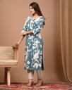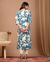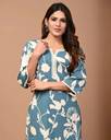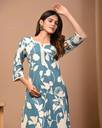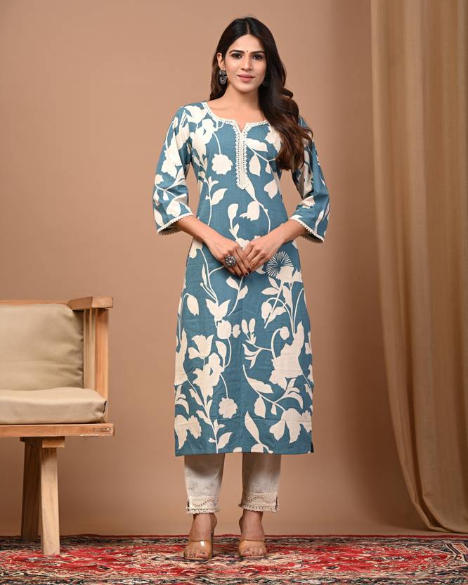 This elegant women’s kurta in a soothing teal shade is crafted from breathable 100% cotton and features an all-over ivory botanical print. The straight-cut silhouette, three-quarter sleeves and side slits strike the perfect balance between comfort and style—ideal for both casual outings and festive gatherings. Finished with a delicate lace-trimmed round neckline, it pairs effortlessly with the following: