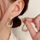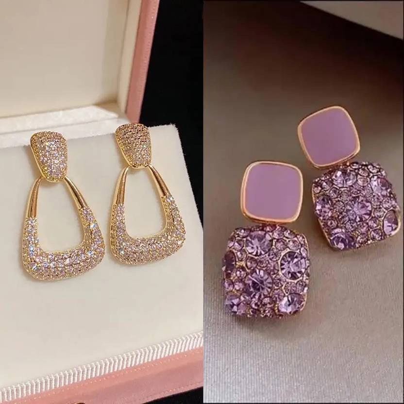 The first pair showcases sophisticated square-framed pearl studs – featuring a luminous pearl encased within a twisted golden square frame adorned with subtle crystal accents. These earrings exude class and simplicity, perfect for elevating office wear, cocktail dresses, or even an elegant saree. Their geometric silhouette paired with a soft pearl center creates a perfect harmony between structure and softness.