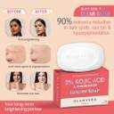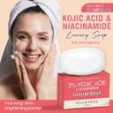 Key Features | - ?? Brightening Ingredients: Packed with 2% Kojic Acid and Niacinamide, this soap helps reduce dark spots, pigmentation, and tanning, giving you clear, glowing skin., ?? Goodbye Tanning: Targets sun damage and tanning, helping to restore your skin's natural brightness., ?? Reduces Pigmentation: Helps fade pigmentation caused by sun exposure, acne scars, or other skin concerns, leaving your skin looking brighter and more even-toned., ?? Gentle Cleansing: Cleans your skin effectively without stripping away natural oils, making it perfect for all skin types, including sensitive skin., ?? Soothes and Calms Skin: Niacinamide helps reduce redness and inflammation, leaving your skin feeling calm, smooth, and balanced., ? Nourishing Formula: Enriched with essential ingredients to support healthy skin and boost its natural radiance., ?? Daily Use for Lasting Glow: Perfect for your everyday skincare routine, it works over time to lighten dark spots and even out skin tone.