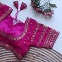 Elevate your traditional wardrobe with this elegant dark green blouse crafted from a rich silk blend. Adorned with delicate golden zari embroidery on the neckline, sleeves, and back, this blouse features an adjustable dori tie-up and a flattering V-neckline. Ideal for festive occasions, weddings, and traditional gatherings, it pairs beautifully with a saree or lehenga.