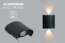 The wall lamp's stylish and sturdy aluminium body blends design and endurance. The use of high-quality aluminium, which also offers robust resistance to dust and dirt, elevates the lamp's appearance. The expertly designed aluminium housing provides a sleek, modern look that complements outdoor settings well.