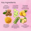Walnut works as an exfoliating agent by gently scrubbing off dead cells from the face., Aloe vera relieves sunburn, boost healing of skin, moisturises, fights ageing, prevents infection and acne, reduces blemishes., Contains antioxidants that help prevent acne and other skin blemishes. The vitamins and minerals present in moong dal also help improve skin texture. Potatoes contain azelaic acid which is known for its skin- brightening properties., Pineapple Rejuvenates the skin and makes it look clean and fresh. Pineapple contains loads of vitamin C and antioxidants that can treat acne, sun damage, and uneven skin tone., Cucumber Cucumber has a cooling effect, helps to calm irritations, revitalises the skin and gently soothes delicate areas of skin like the lips and around the eyes., Use alternate day to keep skin purified, clean, oil free and dirt free.