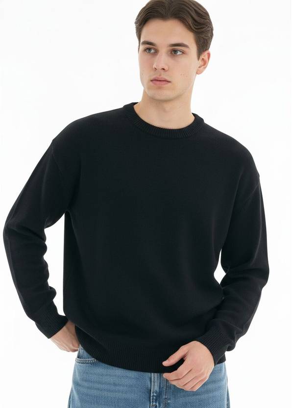 Men Self Design Round Neck Black Sweater