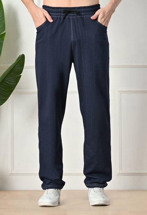 Upgrade your casual wear with these men's denim track pants, combining the rugged look of denim with the comfort of joggers. Crafted from a soft, stretchable denim fabric, they offer a relaxed fit with excellent mobility. Featuring an elastic waistband with drawstring, side pockets, and ribbed cuffs, these pants are perfect for workouts, travel, or everyday wear. Stylish and functional, they pair easily with tees or hoodies for a laid-back yet trendy look.