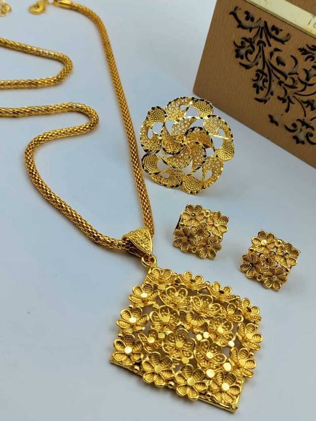 BRASS JAWELLRY set Name: ALLOY JAWELLRY set Base Metal: Alloy Plating: Gold Plated Stone Type: Pearls Sizing: Non-Adjustable Type: P.Set and Earrings With Finger ring Net Quantity (N): 1 P.Set and Finger ring BRASS JAWELLRY GOLD"