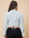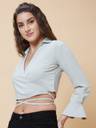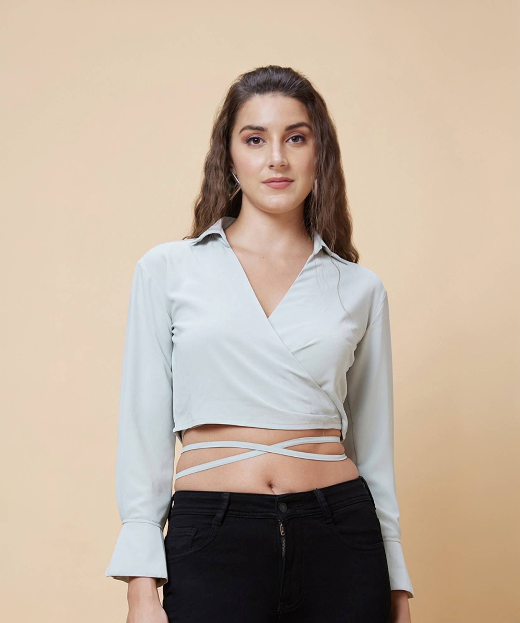 Globus presents these fashionable and classy Women Green Solid Wrap V-Neck Casual Waist Tie-Up Crop Top with Long Cuffed Sleeves. Made with superior quality skin friendly Polyester fabric for comfort of wearing. The Casual Top are sure to keep you looking stylish and feeling comfortable through the day. So go ahead, stand apart from the crowd and create your own trends.