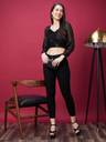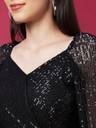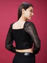 Shine bright in our Black Sequin Wrap Neck Embellished Party Crop Top. This regular-fit, knitted top features embellished details and long sleeves for a glamorous party-ready look. The wrap neck and sequin embellishments create a chic and stylish vibe. Be the star of the party with this black sequin crop top.