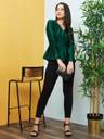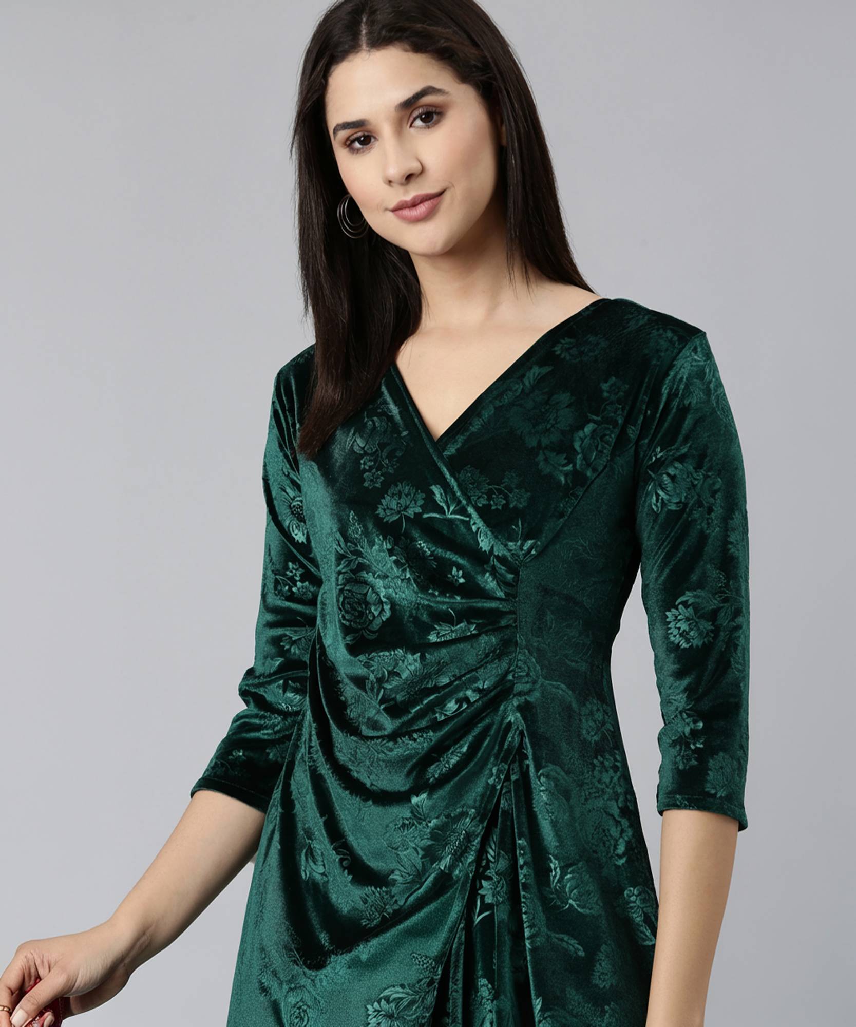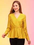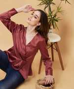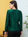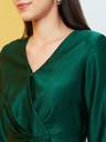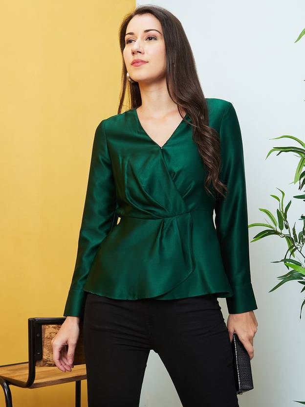Flaunt the Green Wrap Neck Satin Top for an elegant look. The solid green color, cuffed sleeves, and wrap neck create a stylish silhouette. This woven party top features a gathered or pleated design, V-neck, and full sleeves with a touch of satin elegance.