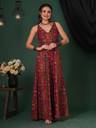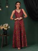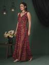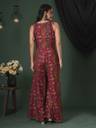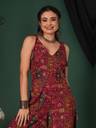 Infuse ethnic charm into your wardrobe with this vibrant maroon floral print jumpsuit. Featuring a V-neck and tassel-tie shoulder straps, this 100% viscose piece flares gracefully for an elegant silhouette. With two handy pockets and intricate detailing, it’s perfect for festive gatherings or cultural celebrations.