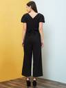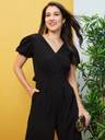 Flaunt your style in our Black Casual Solid Short Sleeves V-Neck Basic Jumpsuit. This versatile jumpsuit features a wrap neck, back tie-up, and wide-leg design, creating a trendy look. The zip closure ensures easy wear, while the balloon sleeves add a playful touch. Make a bold fashion statement in this black jumpsuit with wide-leg pants.