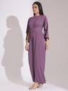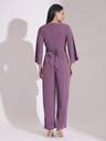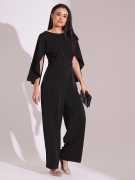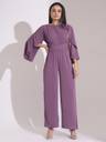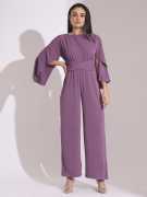 Step into elegance with this satin jumpsuit featuring a boat neck and flowing cape sleeves. The criss-cross waist tie-up adds a flattering touch, making it a must-have for stylish parties. A chic choice for dazzling your evening gatherings.