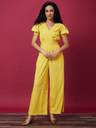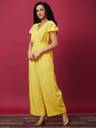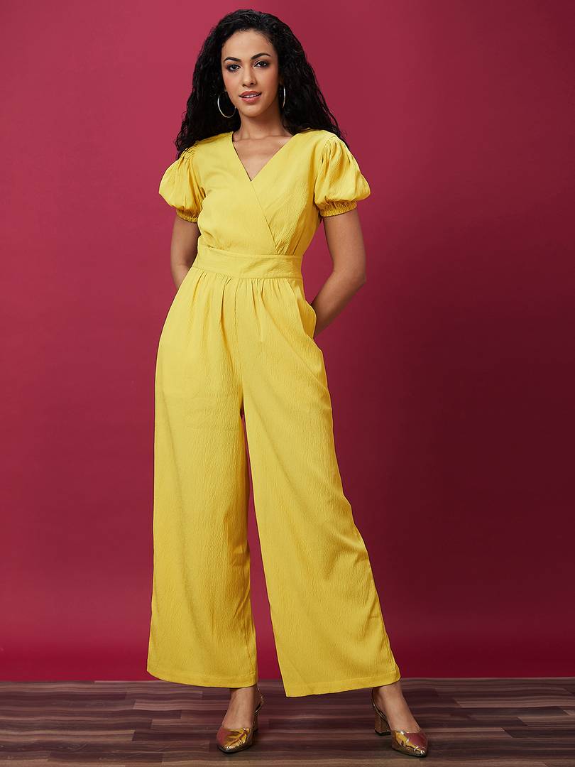 Embrace a casual yet fashionable look with this charming yellow jumpsuit. The wrap neck and puff sleeves add a touch of elegance, while the V-neck and short sleeves provide a comfortable and airy feel. With its basic design and convenient zip closure, this jumpsuit is a practical and stylish choice for various occasions. The solid fabric construction ensures a flattering and relaxed fit, making this V-neck jumpsuit an essential addition to your casual wardrobe