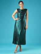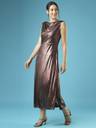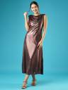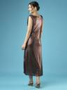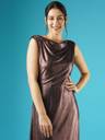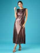 Elevate your party look with the Globus Women Rust Shiny Cowl Neck Side Slit Knitted A-Line Midi Party Dress. Featuring a shimmering rust hue and a flattering cowl neck, this A-line dress exudes sophistication. The side slit adds movement, while the concealed zip ensures a sleek silhouette, making it perfect for special occasions.