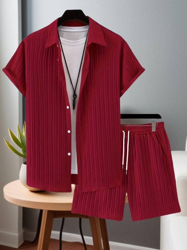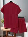 GLORI STAR Men Striped Maroon Night Suit Set