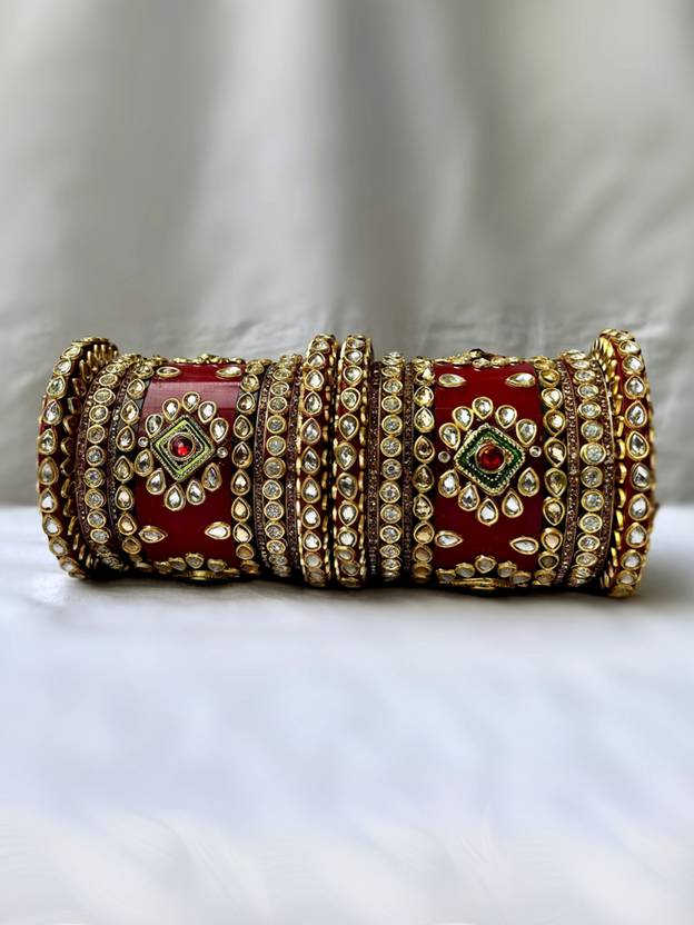 Glossy Finish – Polished surface for an elegant, mirror-like shine that enhances the overall look., Non-Allergic Material – Made from skin-friendly, nickel-free alloy to prevent irritation and allergies., Secure Fit – Designed to stay comfortably on the wrist without slipping or pinching., Lightweight Construction – Feels light on the wrist while still offering a bold, traditional presence., Colorfast Design – Resistant to fading and discoloration, even with regular use., Stackable Style – Can be paired with plain gold or glass bangles for a fuller, layered look., Travel-Friendly – Compact and durable, perfect for storing in travel pouches or jewelry kits., Easy Maintenance – Simply wipe with a soft cloth to maintain its brilliance., Cultural Versatility – Suitable for various Indian traditions including Punjabi, Rajasthani, and South Indian styles.