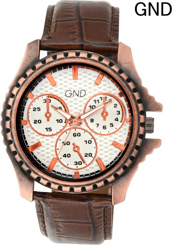 Beautiful At First Sight And Breathtaking When Adorned, The Designer Collection Of Watches By GND Are All About The Added Dose Of Charisma, Which Blend In Elegantly With The Manly Requirements Of Spreading Beauty In Every Stride They Walk With. A Brown Coloured Chains Brought Together To Form the Strap Of The Watch Along With A Round Face Looks Beautiful On Your Wrist. The Contemporary Design Splurged On The Multi Dial Background Cozies Beautifully With The Copper Designer Bezel.