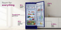 This 234 L refrigerator provides ample storage with specialised compartments for all your needs. It features an 18 L freezer, a 22 L jumbo vegetable tray, and a 2.25 L aqua space, ensuring dedicated zones for frozen foods, vegetables, beverages, and more.