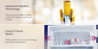 With generous shelf space, you can easily store more groceries, beverages, and containers, ensuring your daily food essentials are well-organised and easily accessible. Furthermore, the Advanced Capillary Technology allows the refrigerant to circulate efficiently between the freezer and compressor, ensuring faster cooling. This improves cooling performance, compressor efficiency, and energy savings.