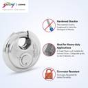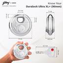 Duralock Ultra XL+ 90mm padlock by Godrej is one of its kind. Designed using superior quality Stainless steel 304, this lock comes with advanced Ultra XL+ Advanced 14 Pins technology which has multi-row 14 pin mechanism making key duplication extremely difficult. The unique enclosed construction makes the lock crowbar resistant, providing you added safety. The bigger keyhead of Ultra XL+ key provides better grip, making it very easy to operate the lock. The colour button on the key aids in differentiating the key of one user from the other. The durability of the product is remarkable. It ensures you get the best usage for a longer period. A stainless steel lock with 90mm hardened steel shackle for all your locking needs. Suitable for both indoor and outdoor use, you can lock shutters of warehouses and shops, Main door aldrops, Grill gates. Key features: SS weather cap - The SS weather cap prevents entry of dust and water. Bigger key head with colour buttons - For easy grip and smooth operation. Trivalent chrome plated shackle - Unlike the traditional hexavalent process, the trivalent plating on the shackle is environment-friendly and is highly corrosion-resistant. Rivetless construction - Makes the padlock very strong. Drill, hacksaw and force resistant, for added safety. Corrosion-resistant - Stainless steel body protects against rust & corrosion thus protecting your property for years. Includes: 1 Godrej lock with 3 keys.