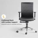 Adjustable lumbar support is provided by upholstered polypropylene pad with moulded polyurethane foam that allows users to get the perfect lower back support
