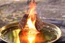 Cow dung cake has been used in yagnas havan homa pooja agnihotra and verious religious activity. It is made from Cow Dung and made by village woman. Cow dung cake is mix of cow dung and paddy husk , hull and paddy straw. It is used to purify air as it is said to release oxygen when burnt with Ghee.